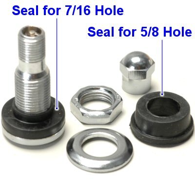 Latest Rage chrome valve stem kit for 7/16in or 5/8in hole. Includes both rubber seals to fit either size hole.