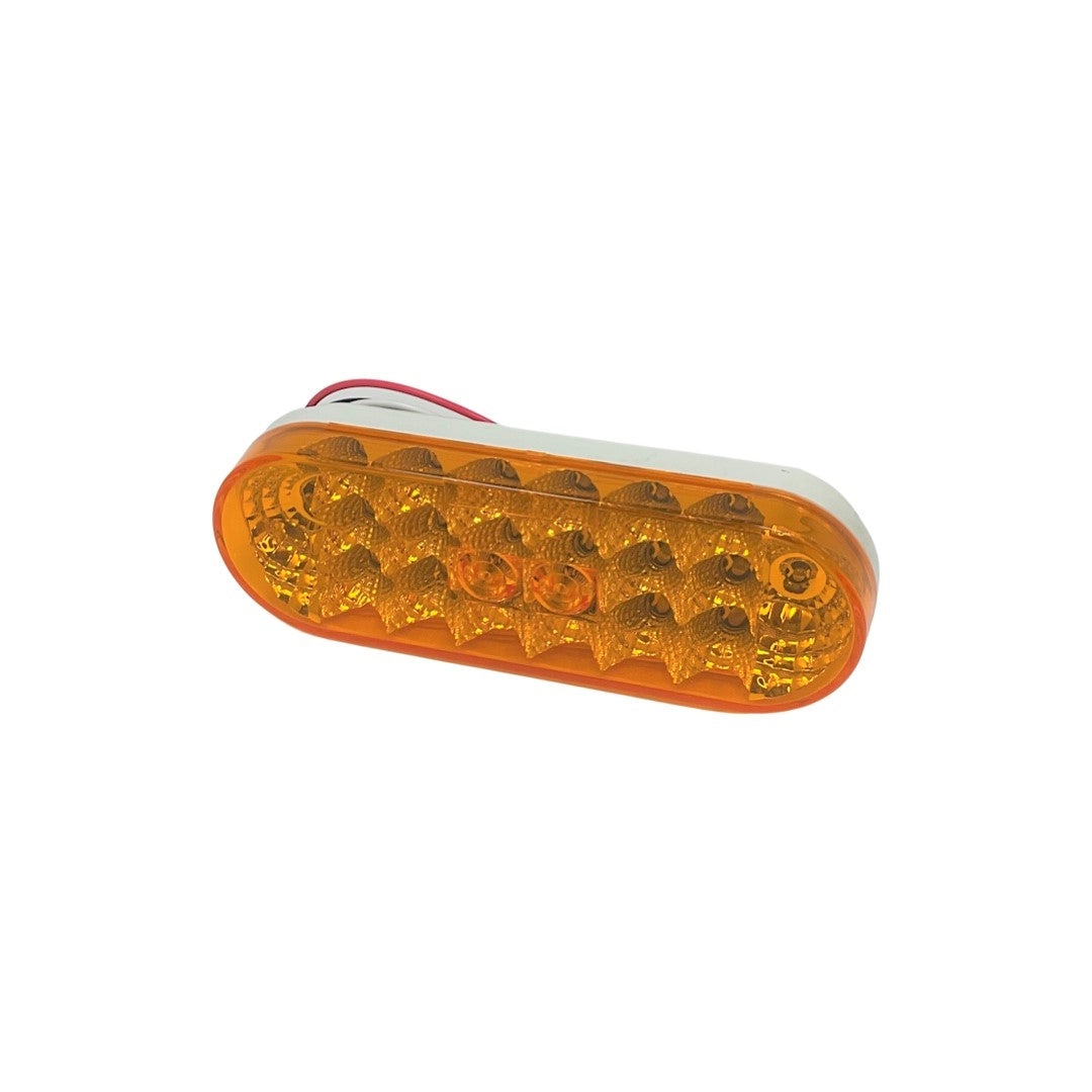 Amber LED marker and turn signal light for trailers, buggies, off road vehicles, and custom applications. Measures 6.5 inch x 2.25 inch. Includes 3 wires: White = ground, Red = 12v power, Black = activate bright.