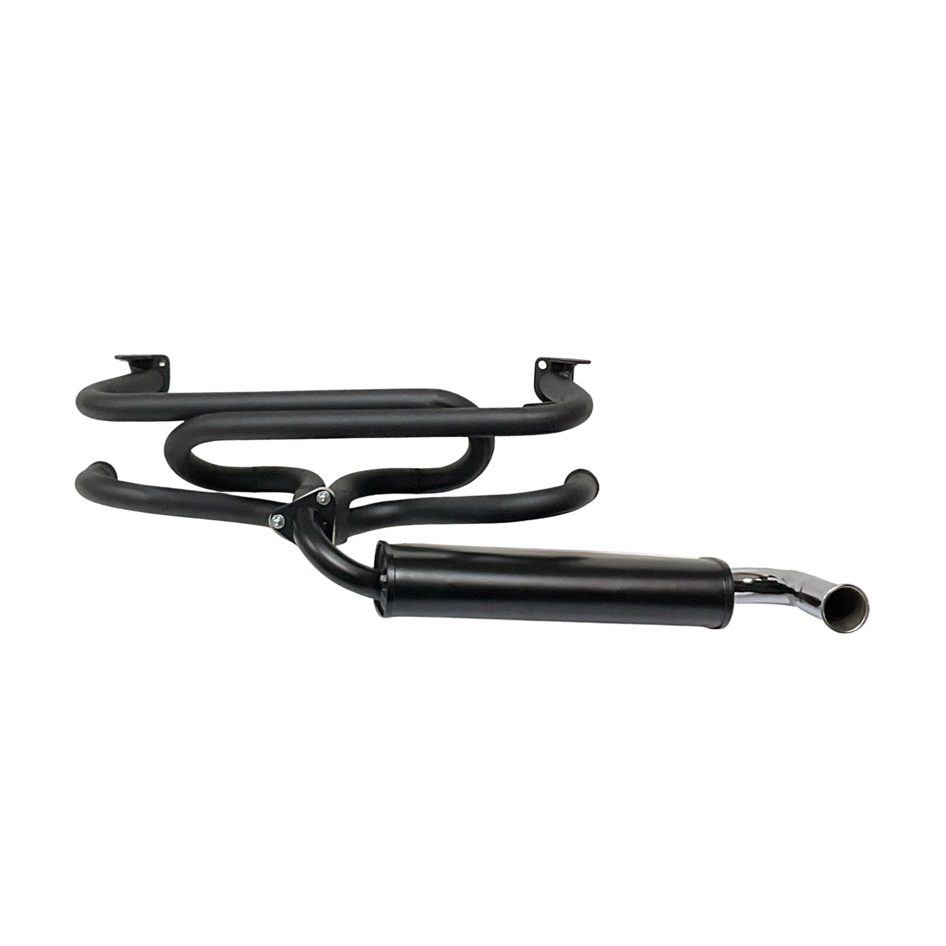 DB1 single quiet pack extractor exhaust. This exhaust and muffler features 1-3/8 inch diameter headers with a single tip exit quiet pack style exhaust. Give your Beetle some bark without upsetting the neighbors. Recommended for 1300-1915cc sized mild street engines.