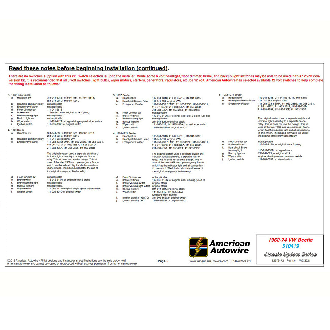 This kit includes several variations of wiring diagrams for various model years of VW Beetle. Model years 1962-65, 1966, 1967, 1968-69, 1970-71, 1972, 1973, and 1974 each have their own version of wiring diagram included in the instruction manual (also available as a PDF online).
