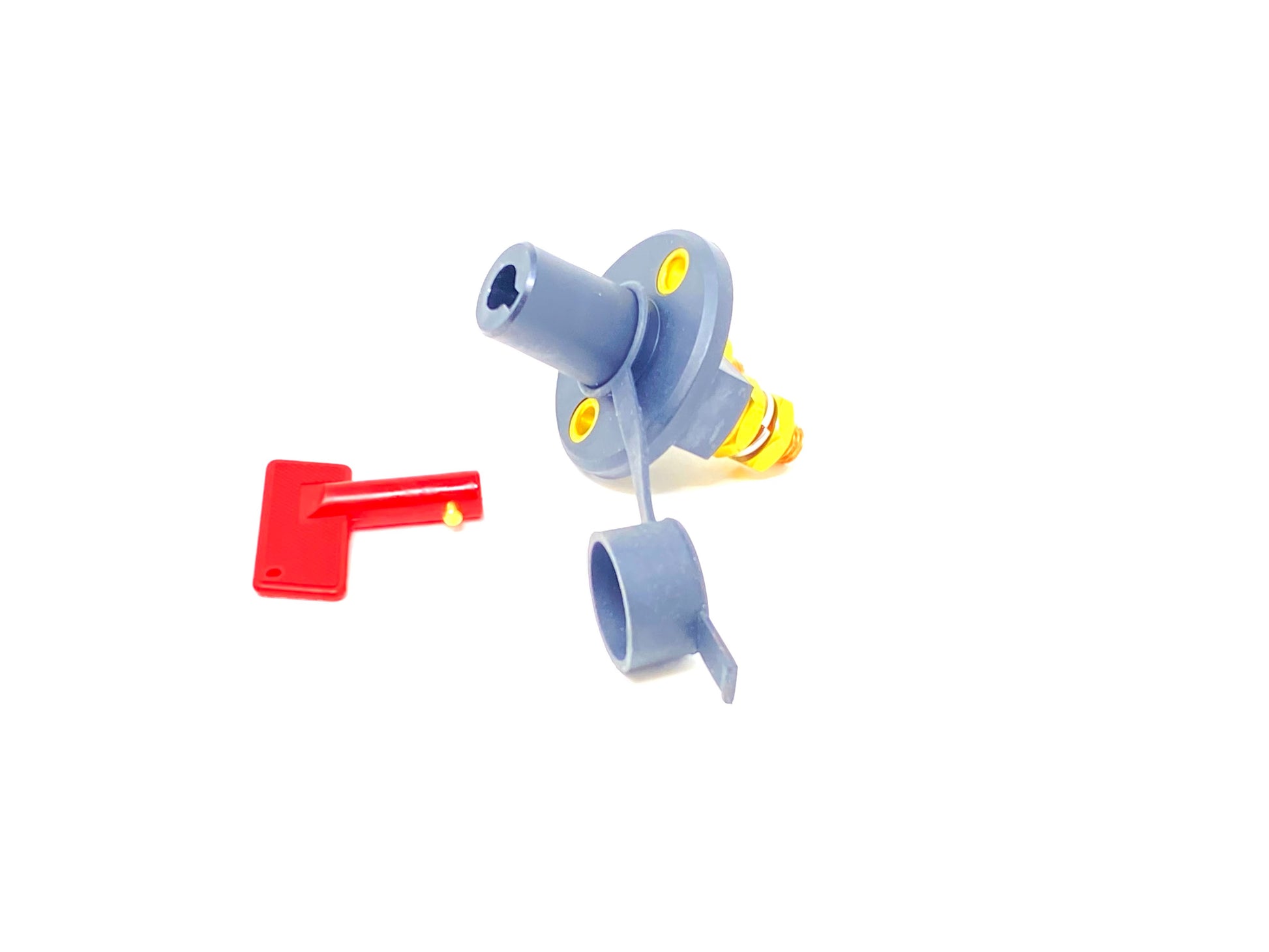 Battery isolator cut off switch with removable plastic key. Uses 3/8 inch post style terminals with a removable seal for the end cap. These cuf off switches are a must for competition and racing vehicles. Great for dune buggy, sandrail, rock crawlers, UTV, side-by-sides, drag racing, hot rods, and custom builds.