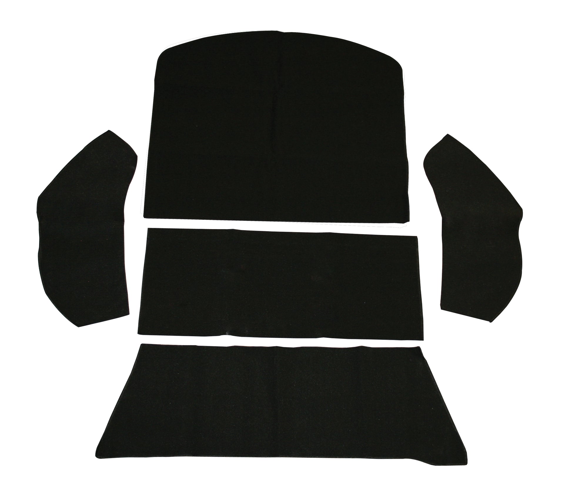 Empi black 5-piece rear well cargo area carpet kit for 1973-77 Beetle Sedan and Super Beetle Sedan. This kit covers the rear wheel wells and parcel tray behind rear seat. Alternate part numbers 3916, 00-3916-0, 0039160.