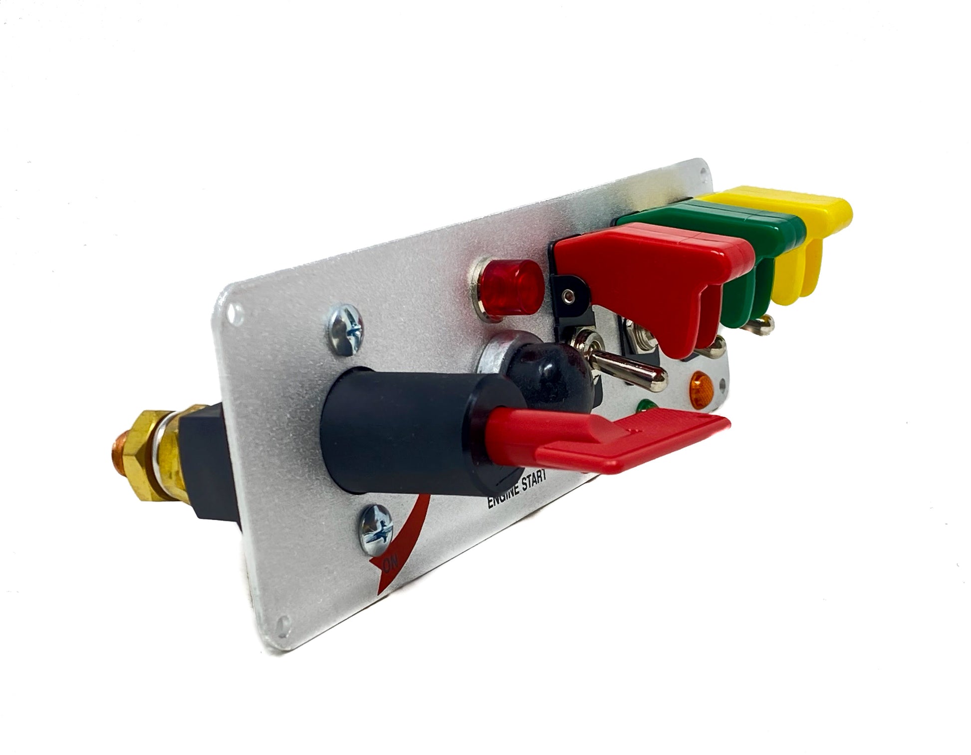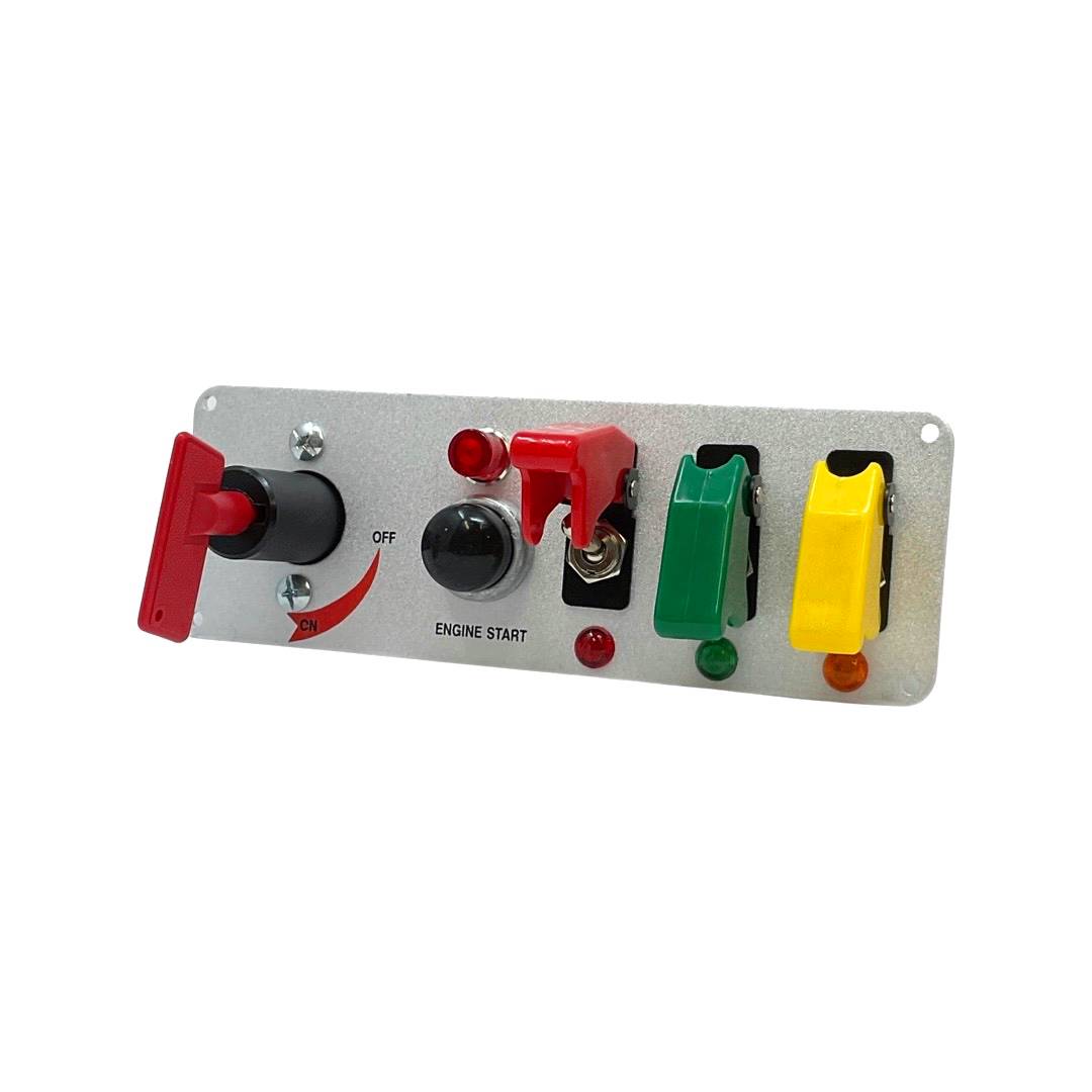 Ignition switch panel assembly or accessory dash panel features battery disconnect, momentary push button, and 3 toggle switches with 4 indicator lights. The battery disconnect cut off switch is a must for competition and racing vehicles.