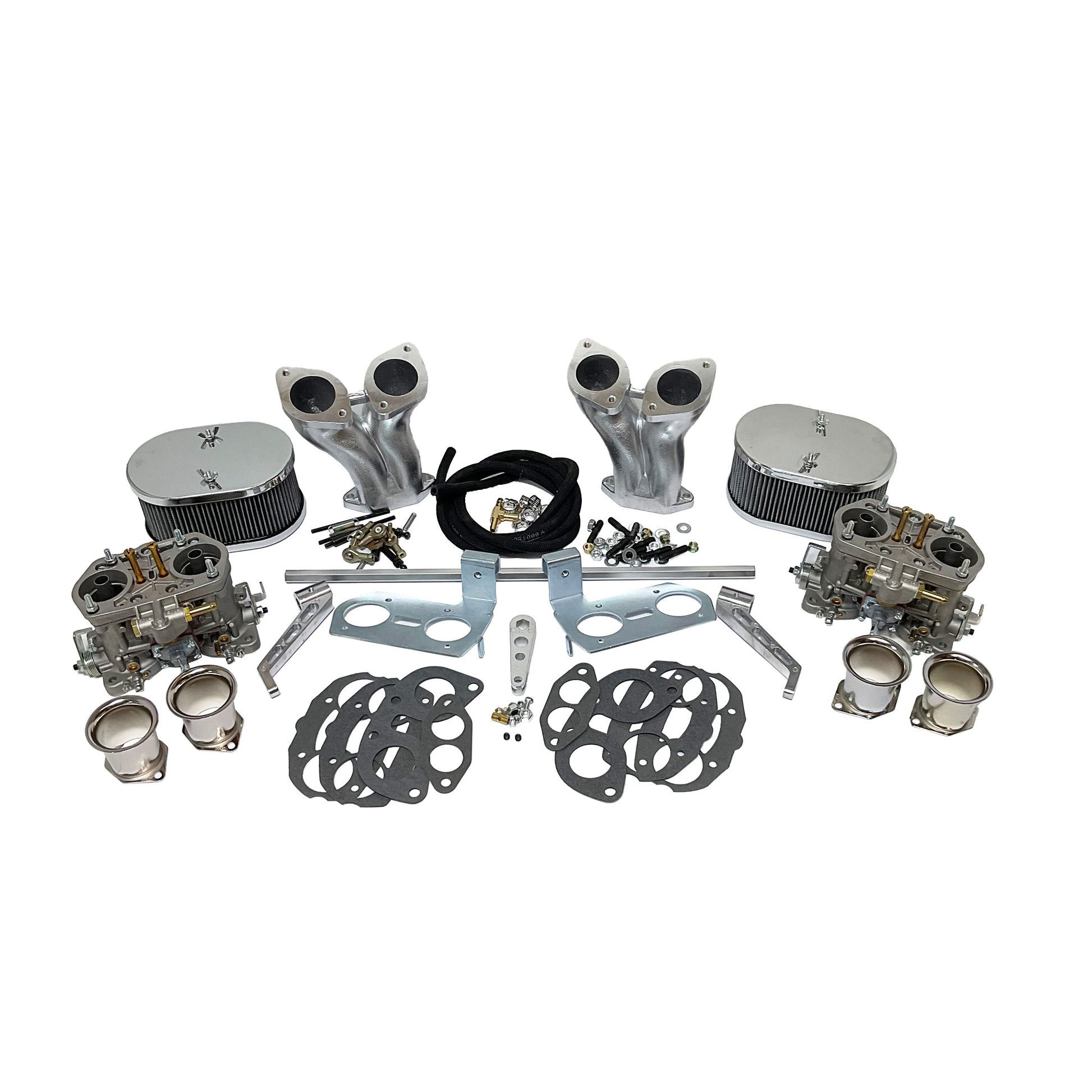 DB1 dual 44 IDF/HPMX style carburetor kit for Beetle, Ghia, and Bus with dual port upright VW Type 1 engines. Includes carburetors, air cleaner assemblies, intakes, gaskets, fuel tee and hose, and linkage kit. Everything you need to install into a stock VW Beetle or VW powered rail buggy. This is the most economical dual carburetor kit for the DIY-er looking for performance on a budget.