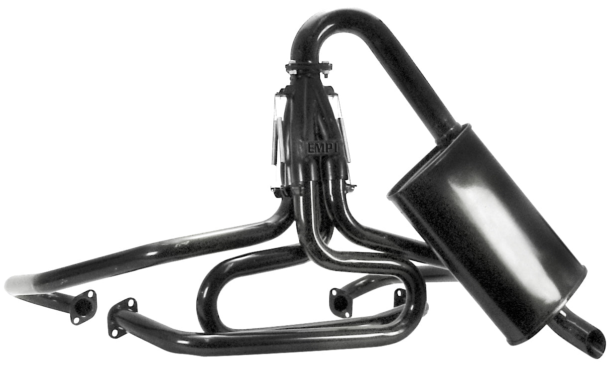Empi 1-1/2 inch header size black style off road competition style exhaust with turbo muffler. This exhaust uses a spring attached collector and replaces the entire stock exhaust system. Eliminates stock heater boxes