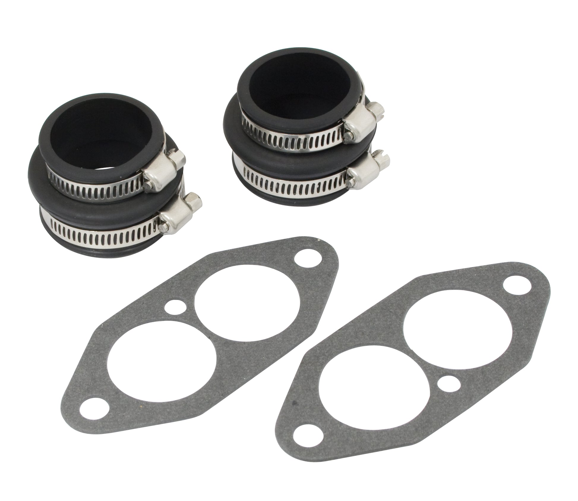 Empi black rubber dual port install kit with intake gaskets, boots, and clamps. Fits dual port 1971-1979 VW Beetle, 1971-74 Karmann Ghia, 1967-73 Type 3, and 1971 Type 2 Bus. Alternate part numbers 0034120, 0032280.