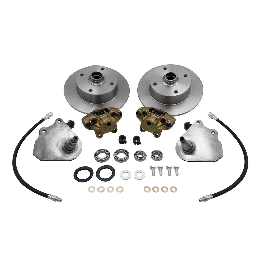DBW 6075 link pin 2.5 inch drop spindle 4x130mm lug pattern disc brake conversion kit. This kit fits 1949-65 VW Beetle and Karmann Ghia with King Pin or Link Pin style front ends and converts to 4-lug VW style disc brakes, Ghia style calipers, and drops your front end 2.5 inches. Alternate kit number 22-2881-0