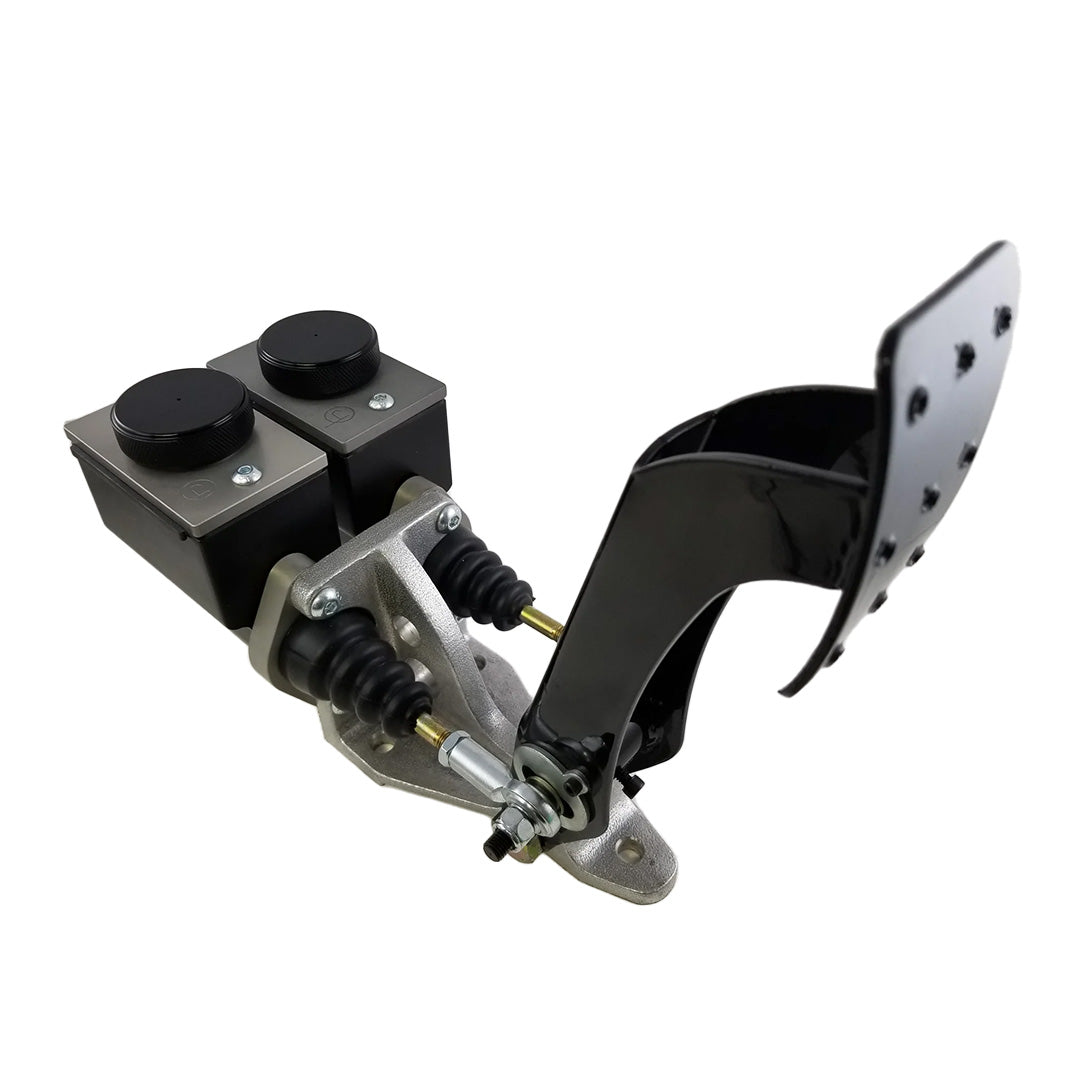 Jamar dual reservoir floor mount brake pedal assembly with 11/16 inch master cylinders. Pedal includes adjustable brake bias bar which can help with performance or racing applications to balance front/rear bias. Master cylinders are threaded for 1/8 NPT standard fitting sizes.