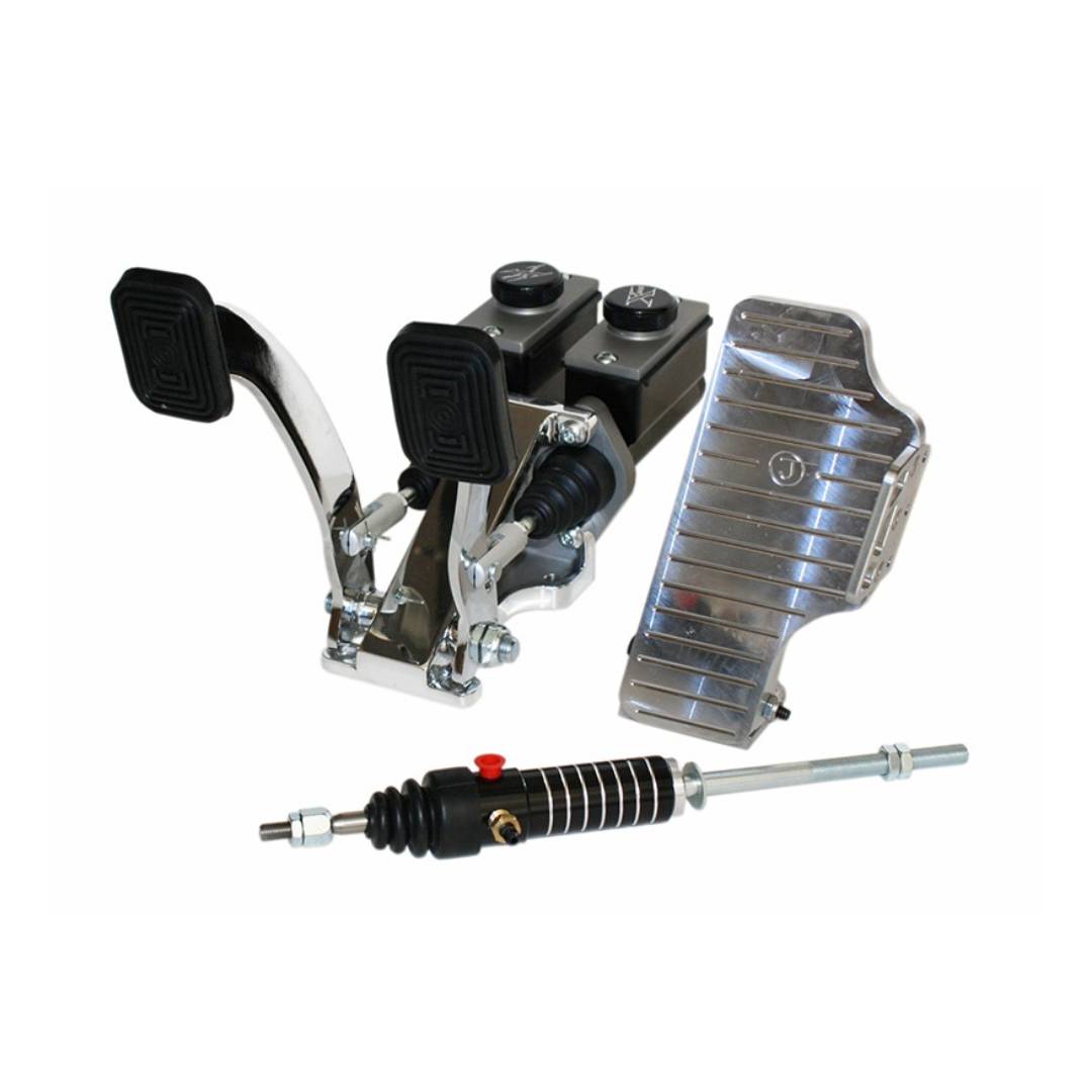 Jamar slimline hydraulic pedal assembly with billet gas pedal and slave cylinder. Features 3/4in brake master cylinder and 11/16in clutch master cylinder. Recommended for 2 wheel disc brake setups or lighter weight 4 wheel disc setups.