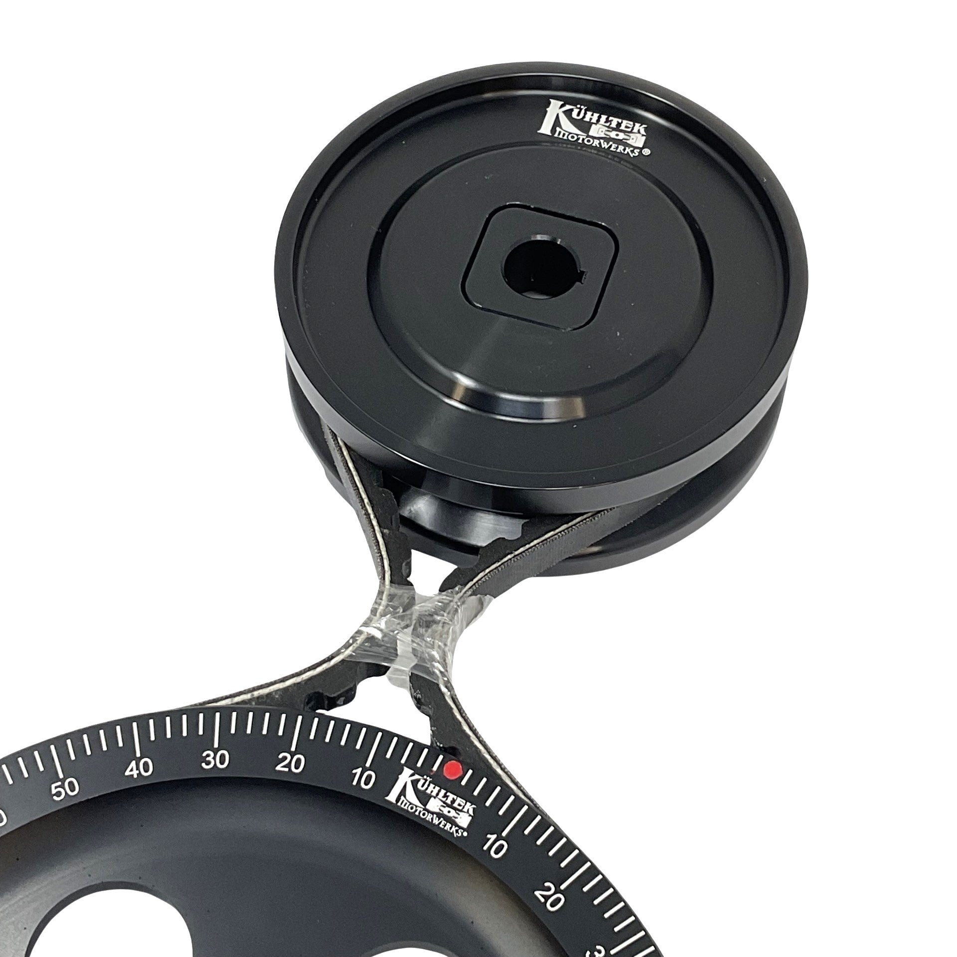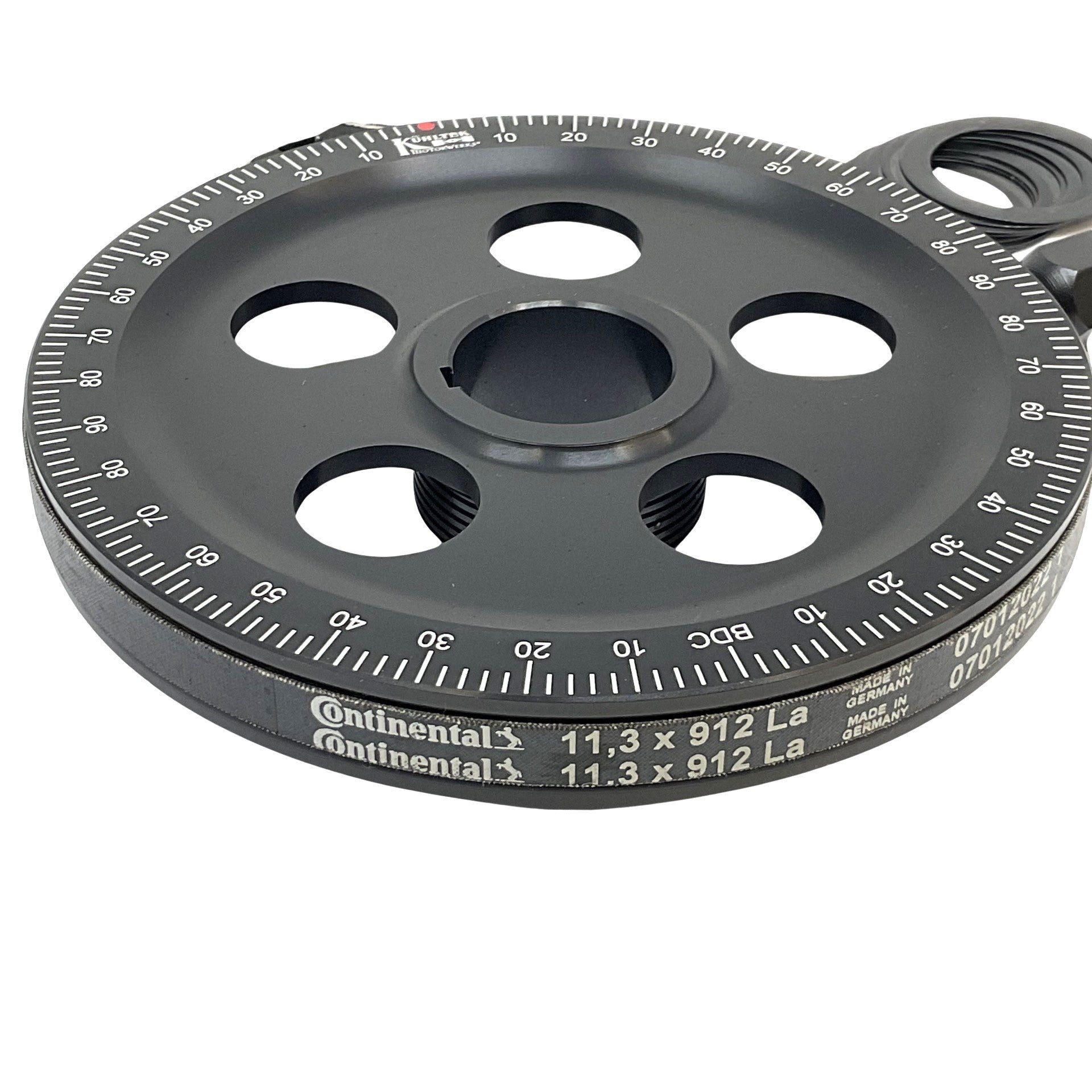 Kit includes billet alternator or generator pulley, shims, upper pulley bolt, crankshaft pulley with red dot at TDC and timing marks, and a Continental 11.3x912mm belt for alternator applications.