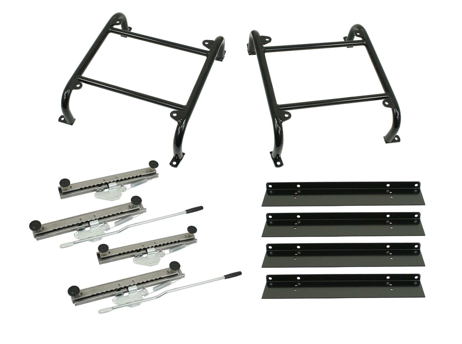 Universal seat mount kit with seat sliders. This kit allows for mounting of a pair of seats in a dune buggy, woods buggy or off road vehicle. EMPI's dual seat mount kit includes seat mounts that elevate your seats, slider rails and wide seat mounting plates. This is great for a custom application where the seat needs to be elevated and have the ability to slide. These seat mount kits are designed as a universal application. Each kit will mount two seats.