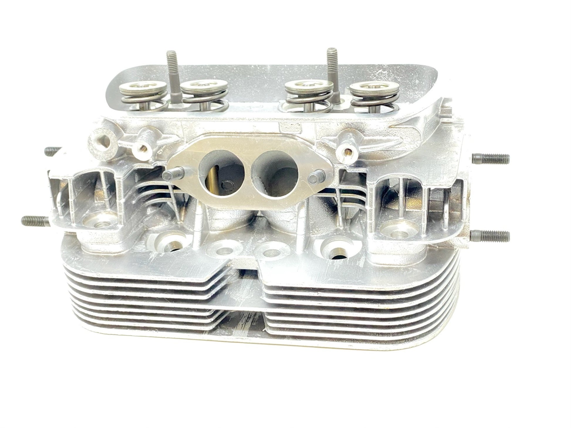 043-style 85.5mm cylinder heads feature steel valves, stock valve springs, steel retainers, hardened keepers, intake and exhaust studs. Features 35.5mm intake valves and 32mm exhaust valves. Includes untapped head temp sensor hole for fuel injected applications. Combustion chamber volume approximately 53cc. Alternate part numbers 043101355CK, 98-1356-B, 981356B.