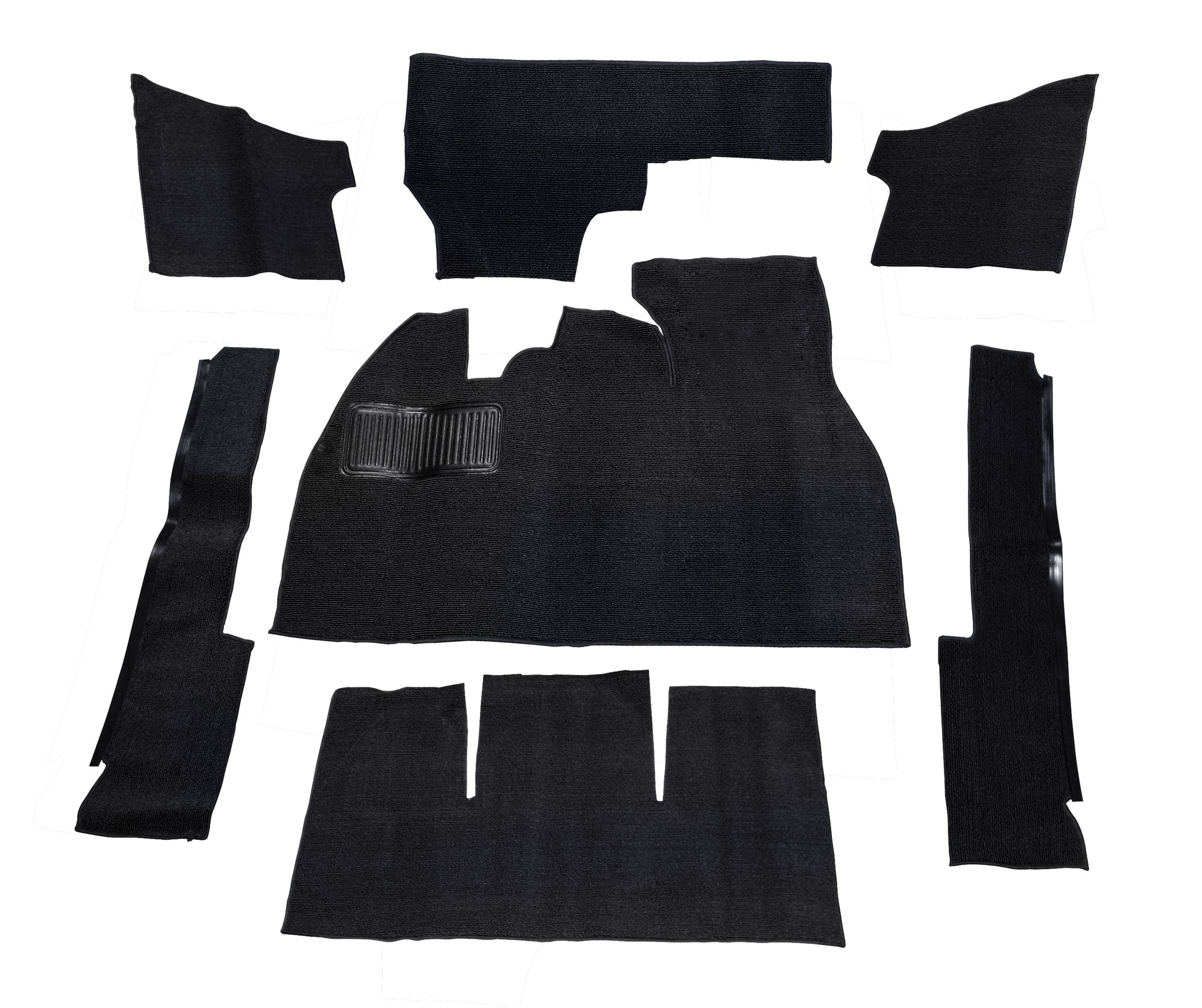 Empi black 7-piece carpet kit with footrest for 1971-72 Super Beetle. This carpet kit is for vehicles with passenger footwell footrest still in place. Alternate part numbers 3917, 00-3917-0, 0039170.
