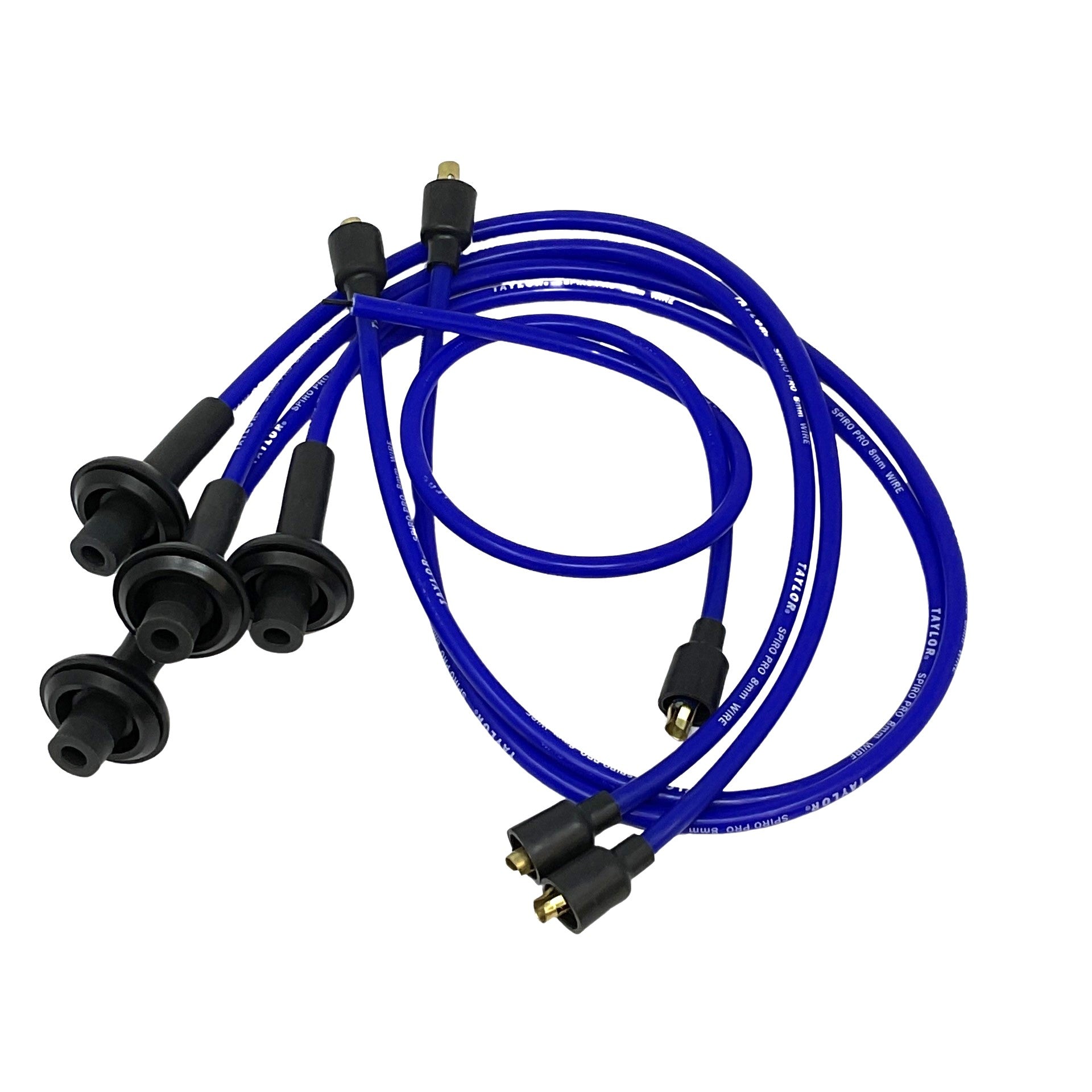 Taylor Wires 8mm Spiro-Pro blue spark plug wire set for 1200-1600cc VW Type 1 Beetle, Karmann Ghia, Thing, Type 3, and Bus with Type 1 style engine. Spiraled stainless steel core with a silicone outer jacket and inner core. Includes 4 plug wires and coil wire.