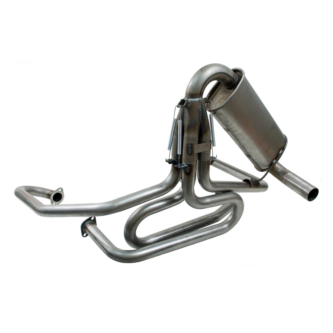 Tri-mil 1-5/8 inch raw steel buggy exhaust with quiet pack style muffler. Fits 1300-1600cc VW Type 1 engines. Includes exhaust, header/collector, collector springs, and muffler.