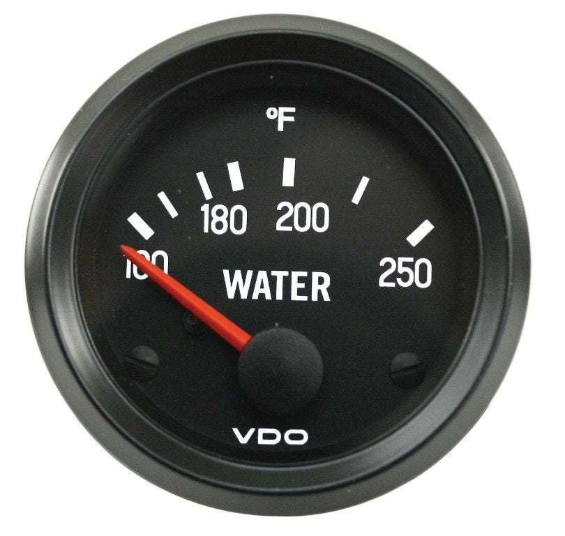 VDO V310039 cockpit series 12 volt water temperature gauge for 2-1/6 inch or 52mm dash hole. This gauge features 100-250F water temperature scale, compatible with 12 volt applications and is compatible with standard 1/4-inch spade connectors.