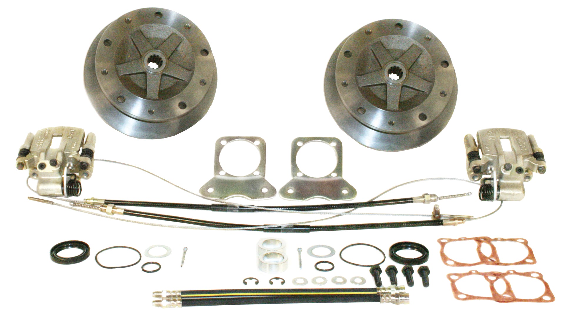 EMPI Wide Track Rear Disc Brake Kit with E-Brake. This brake kit offers extra wide rotors to give you 1" of extra width per side. Wide 5x205 bolt pattern allows stock VW wheels and off road wheels to bolt-on directly. Rotors double drilled for 14 mm and 12 mm wheel studs or bolts. This kit includes rotors, caliper brackets, brake hoses, wheel seals, rotor spacers and emergency brake rear calipers. For use with 15 inch wheels.